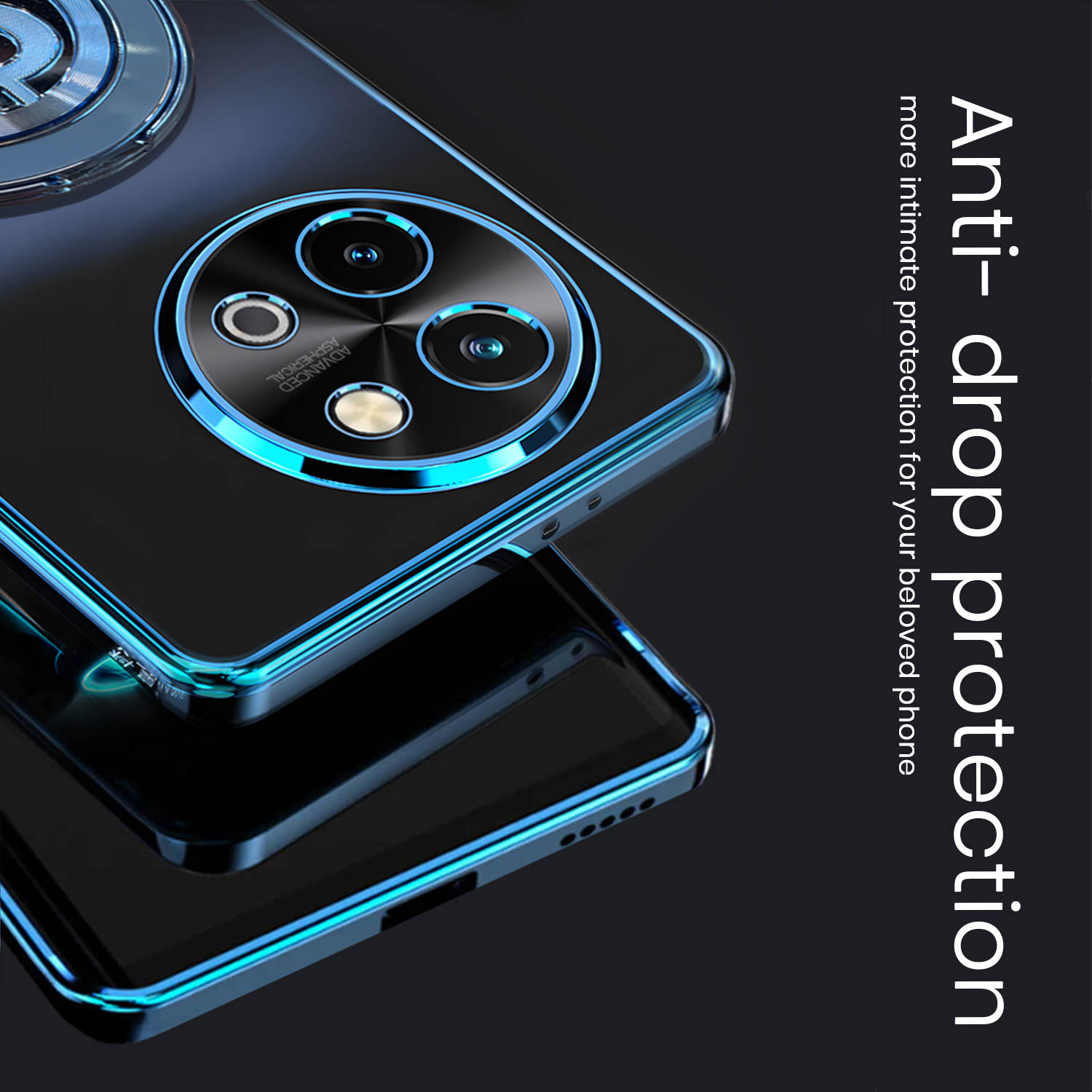 This luxury smartphone case features a sleek and transparent electroplated design with a glossy blue outline that enhances the overall aesthetics of the phone. The back showcases a unique matte pattern, offering a premium tactile feel that is both stunning and elegant. Designed with precision, the case provides an exact fit, ensuring no sliding or misalignment.